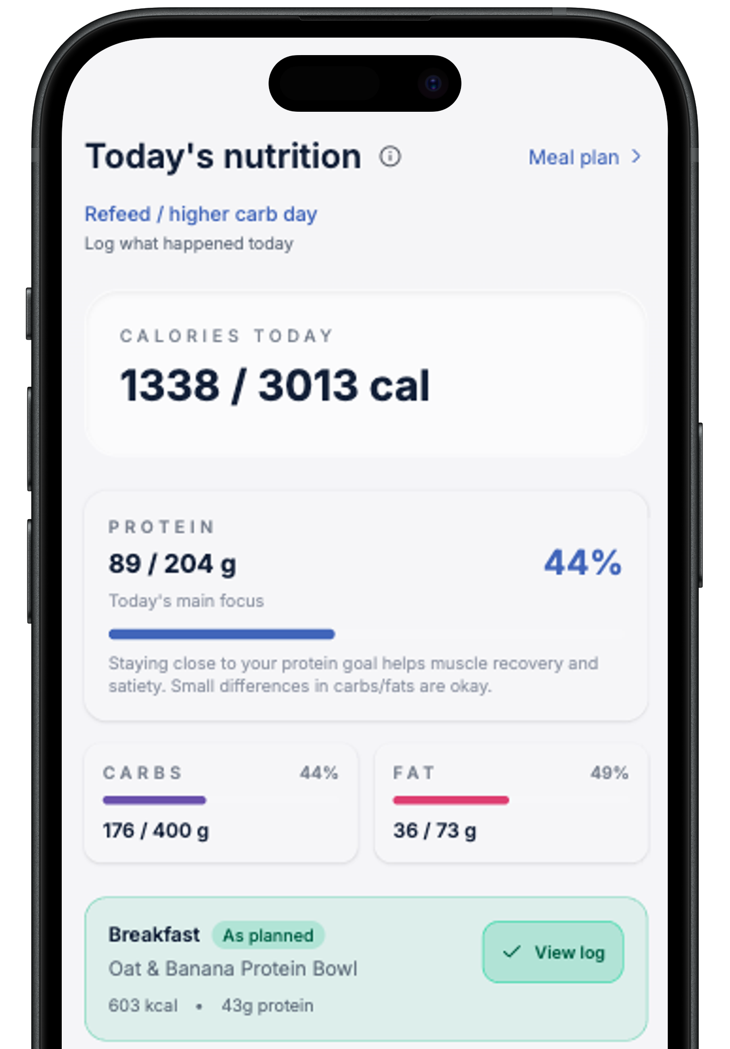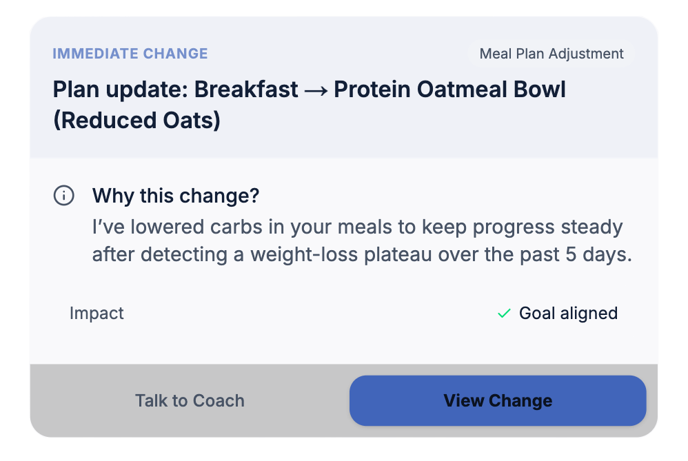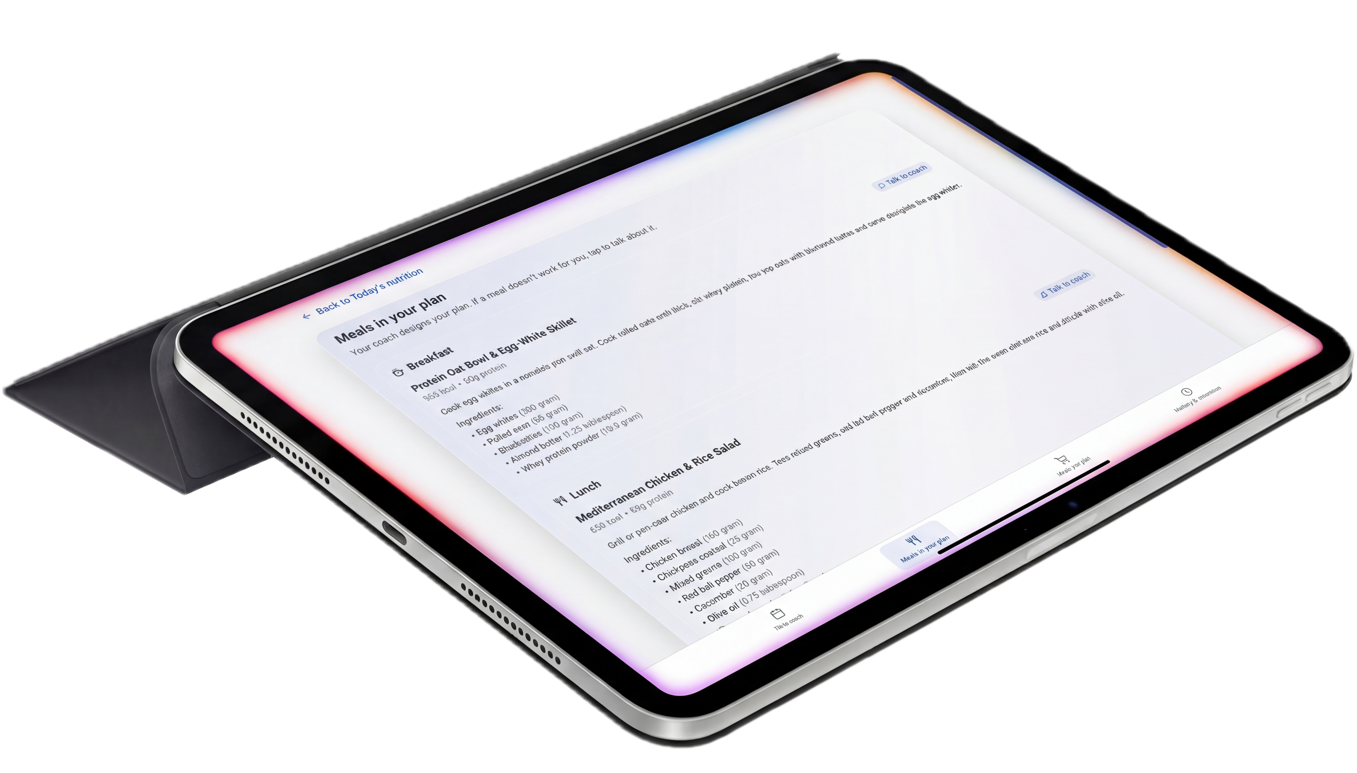 A coach you can collaborate with. Meal plans and workout schedules are created for your goals. Daily logs and conversations with your coach continuously optimize your plan for progress. Every adjustment is made to move you closer to your goal.