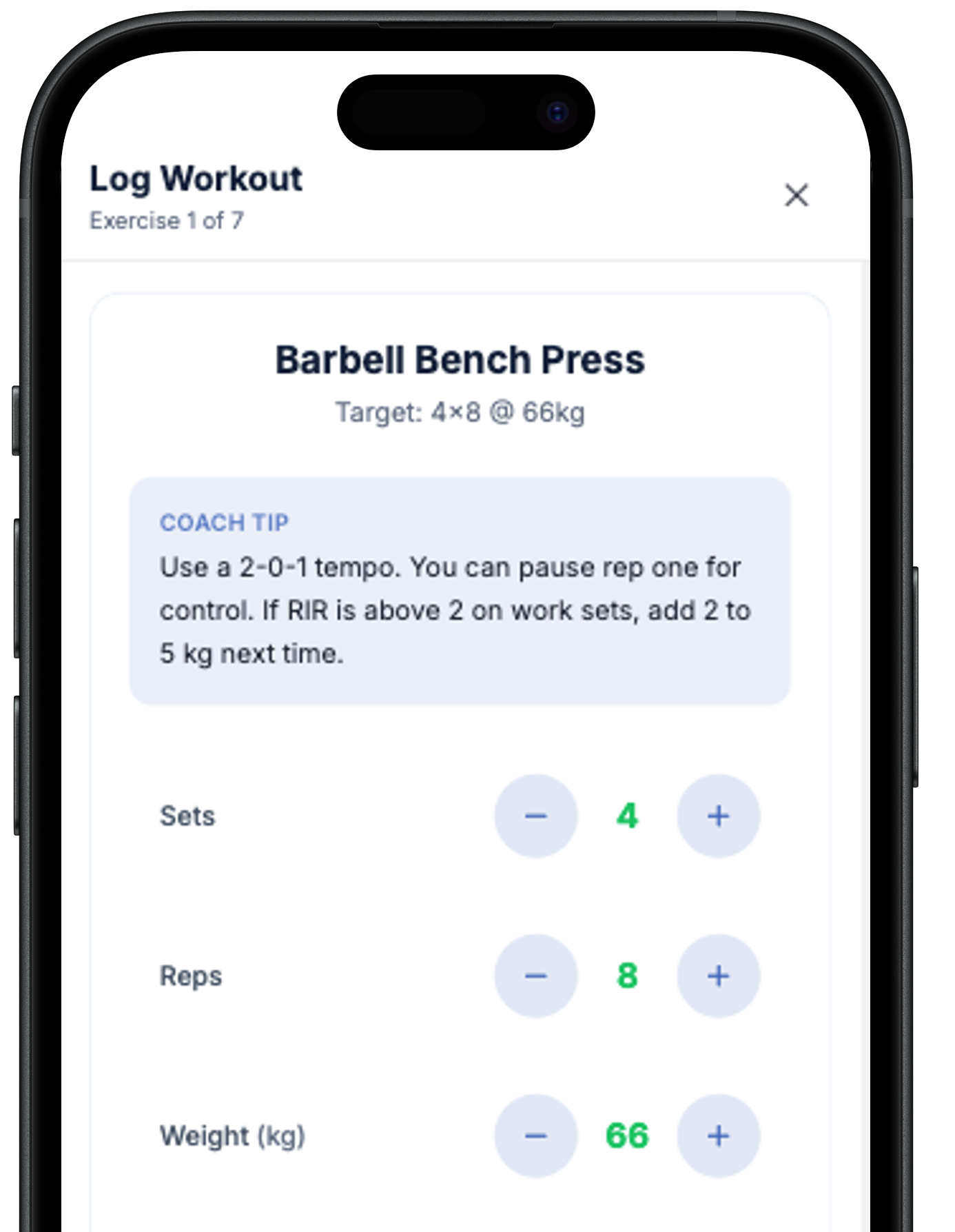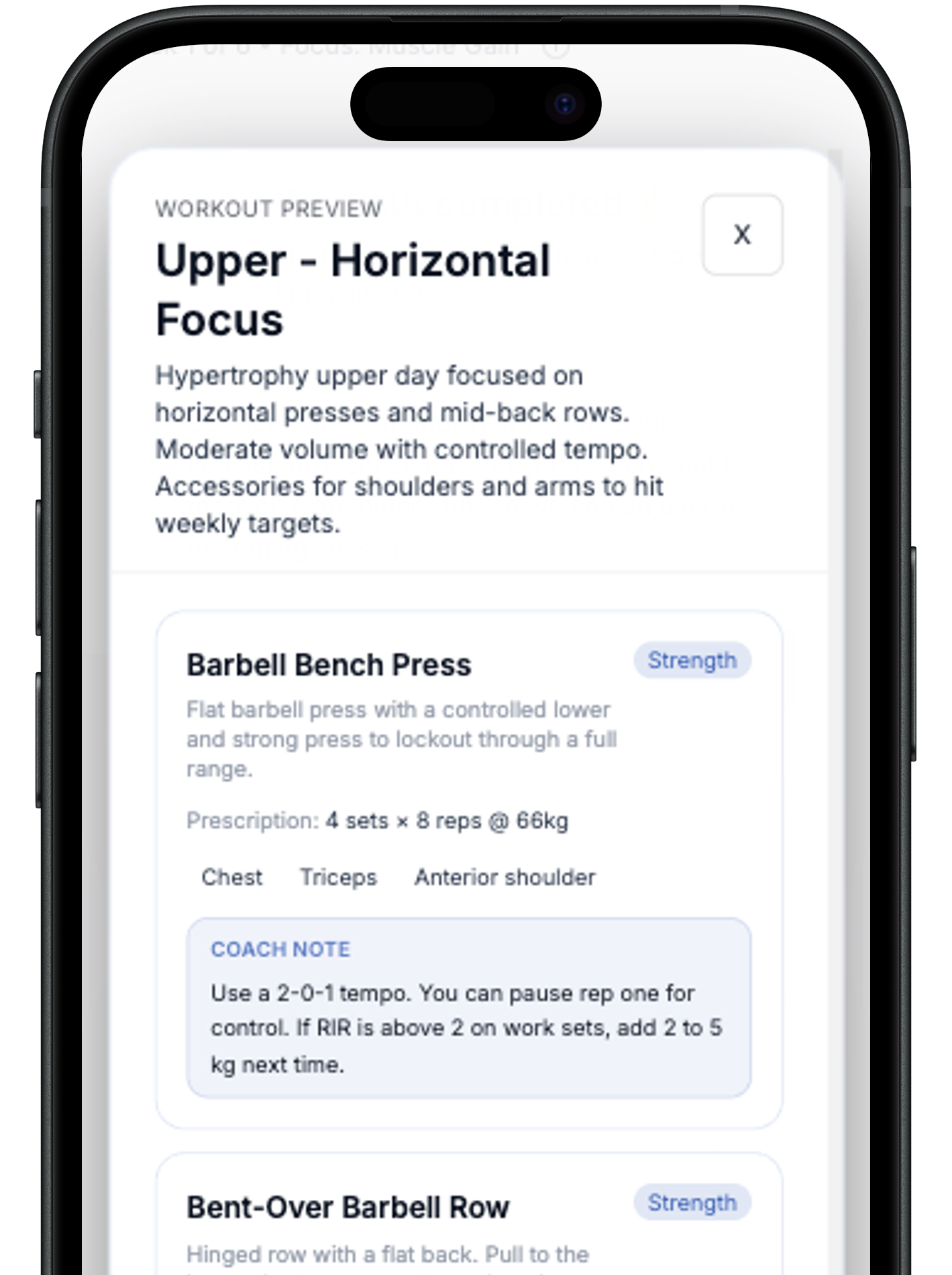 Structured training, designed around you. Your workouts follow progressive training blocks built from your available equipment and preferred movements. Volume and intensity adjust as your body responds.